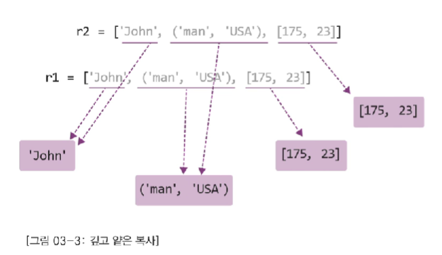 깊은 복사는 반대로 리스트가 참조하고 있는 대상이 있을 때에 그걸 통째로 복사한다.