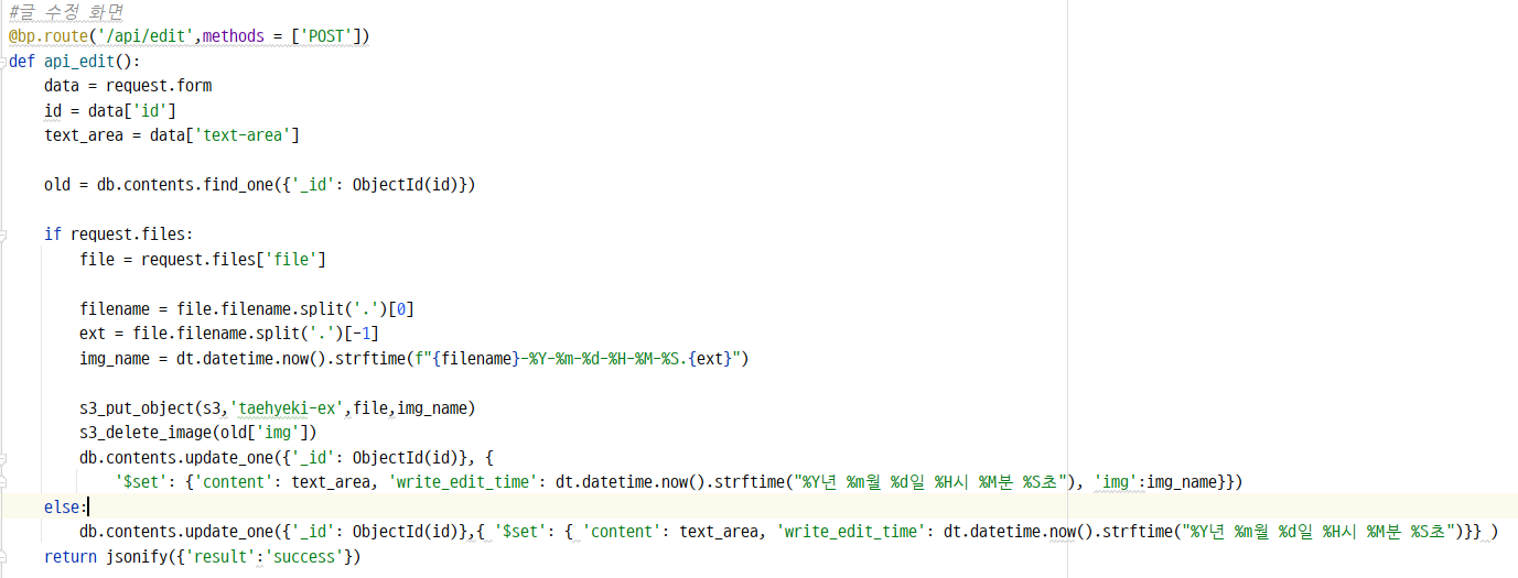 먼저 form을 통해서 id와 file, 그리고 text를 받아온다. 여기서 2가지의 경우를 생각해야한다. img파일이 바뀌었을 경우와 그대로인 경우이다. img파일이 바뀌었다면 request.files에 데이터가 들어올 것이고, 안바뀌었다면 request.files가 비어있을 것이다. 따라서 분기문을 활용하여 존재하는 경우 그 파일을 네이밍 시켜서 s3에 업로드하고 이전 파일을 삭제해주면된다. 이전 파일을 추적하기 위해서는 old라는 변수를 만들고 거기에서 기존의 img이름을 가져와서 지워주는 방식을 활용했다. 그리고 새로운 파일이름을 img에 넣어주자