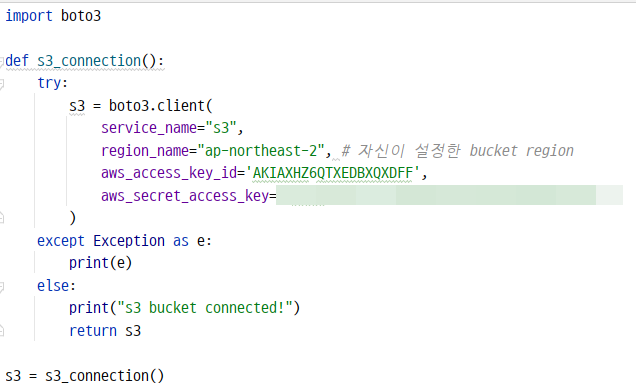이렇게 해서 s3와 연동을 할 수 있다. python과 연동을 하기 위해서는 boto3라는 모듈을 설치해야한다.