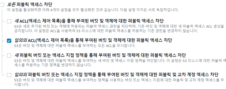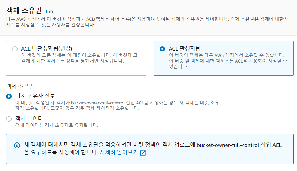 나는 아직 s3, aws등 잘 모르기 때문에 설명은 못하지만.. 내가 하는 방식으로 했을 때 ACL 활성화 됨을 눌러야 한다.