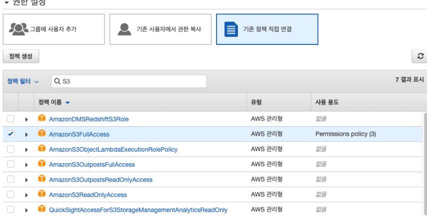 - 권한에서 이제 AWS S3에 접근하는 사용자를 만들어주자. 다음과 같이 클릭해 권한을 넣어준다.