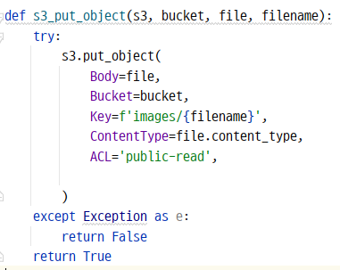 s3, 버킷명, 파일, 파일이름을 받아와서 s3에 전송해주는 기능을 한다.