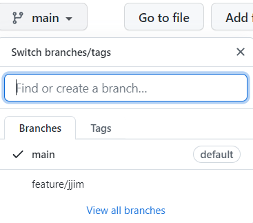 그리고 깃헙에 가서 브랜치를 누르면 main 밑에 feature/jjim이 있는 걸 확인할 수가 있다.