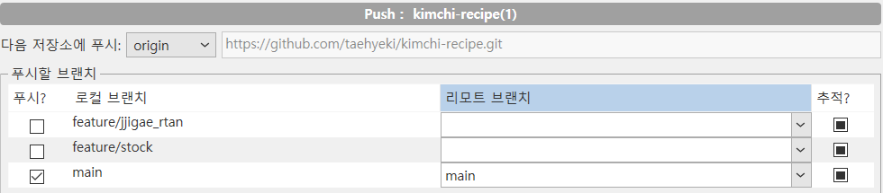 로컬의 main과 원격의 main이 연결되어있다는 뜻이고 로컬->원격으로 푸시를 한다는 이야기이다. 확인을 눌러보자