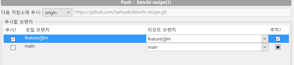 현재 jjim branch에 체크아웃이 된 상태인지 확인을 하고 푸쉬 버튼을 누르고 jjim브랜치를 체크하면 자동으로 리모트 브랜치의 이름이 생성된다. 확인을 눌러보자