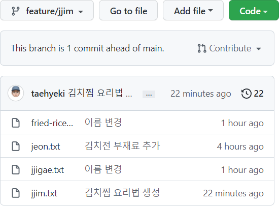 저걸 클릭하면 jjim.txt가 보일 것이다. main 브랜치에서는 안보임