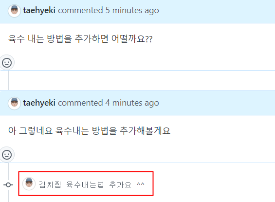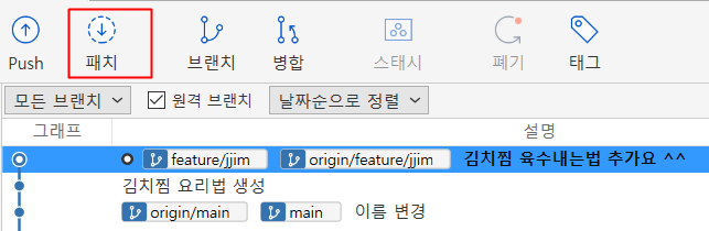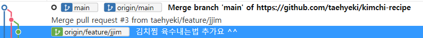 만약 추가 수정을 제안받았을 때 로컬 repo의 feature/jjim 에서 commit후 원격 repo의 feature/jjim으로 push하는 것이 일반적이다. (육수내는법 추가)