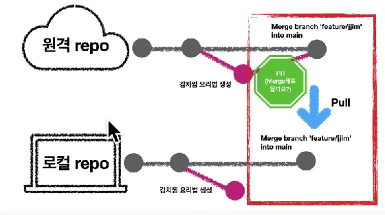 PR(Pull Request)느 내 작업내역을 바로 merge하지 않고 참여하고 있는 프로젝트 내 작업(branch)을 merge해달라고 요청(Request)을 먼저 보내는 것이다.