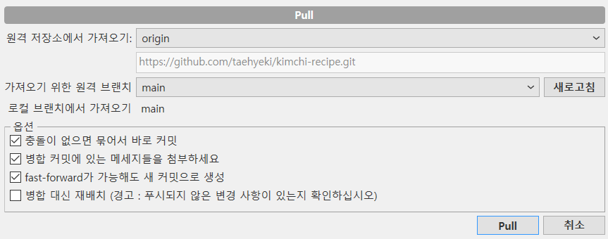 pull은 main에 해야하니 main으로 체크아웃을 한 뒤에 진행해주어야한다.