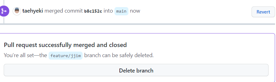 그럼 이제 main 브랜치에도 jjim이 잘 올라와있는 것을 확인할 수가 있다.