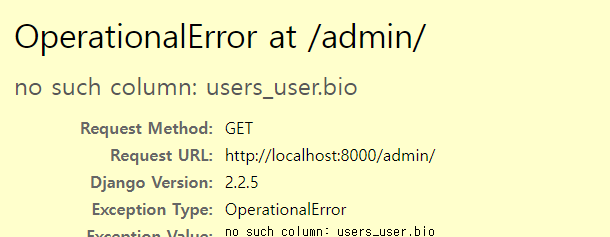 근데 테이블에 bio라는게 없으니 오류가 난 것이다 따라서 makemigrations migrate를 하면 오류가 해결 될 것이다.