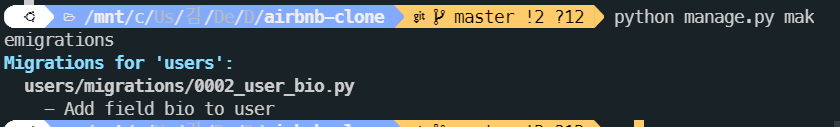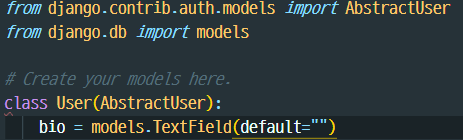 User에 bio필드를 추가하고 makemigration과 migrate를 진행해주었다.