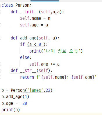 위와 같은 클래스를 만들었다고 해보자. add_age는 나이를 추가해주는 함수이다. 나이는 기본적으로 음수가 될 수 없으니 사전에 음수를 차단하는 기능을 만들어주었다.