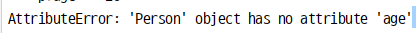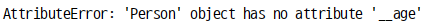 위 처럼 __를 붙여주고 다시 실행시켜보면 아래와 같은 오류가 난다. Person에는 age라는 변수가 없다고 한다.
