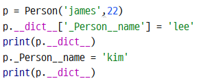 __name이 _Person__name로 바뀐 것을 알 수 있다. 따라서 이름이 바뀌었으니 정보에 접근이 불가능 했던 것이다.