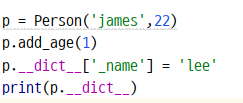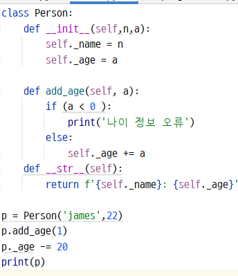 이제 외부에서의 접근을 완전히 막아버렸다. age를 추가하기 위해선 저 add_age를 통해서만 접근이 가능하도록 허용범위를 좁혀둔 것이다. 이걸 정보은닉이라고 한다.