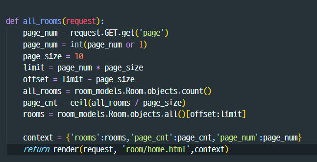 page_cnt는 all_rooms를 사용하여 전체 페이지 수를 나타낼 수 있다.