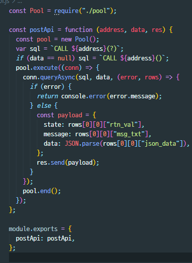 각 라우터에서 postApi라는 걸 사용하는 것을 확인할 수 있다. 여기에 프로시져 이름과, 프론트에서 받아온 데이터, 그리고 res를 넣어주었다. res를 넣은 이유는 저 postApi에서 값을 return할 수 있는 방법을 못찾았기에 어쩔 수 없이 저 함수 안에서 res.send()를 사용하기 위함이다.