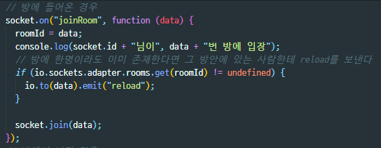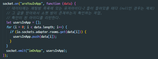 data의 값으로 로그인 한 유저 자신이 속해 있는 채팅방 목록 (방번호-1)들을 담아 보낸 뒤 그 for문을 돌려 하나씩 그 방이 현재 존재하는지 확인을 한다. ( io.sockets.adapter.rooms.get(data[i] 만약 없다면 undefined가 나온다. ) 이로 인해서 undefined가 나오지 않으면 상대방이 현재 접속해 있다는 것을 확인할 수 있다. 그리고 이렇게 필터링 된 값들을 다시 클라이언트 소켓으로 보내고 클라이언트는 이 값을 바탕으로 프론트에 그려줄 수 있다.
