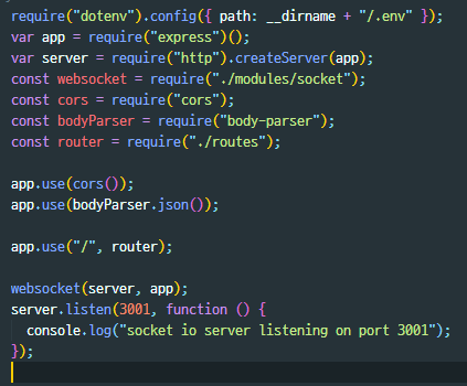 먼저 노드 서버이다. 채팅 기능밖에 없기 때문에 상당히 단순해 보인다.