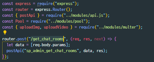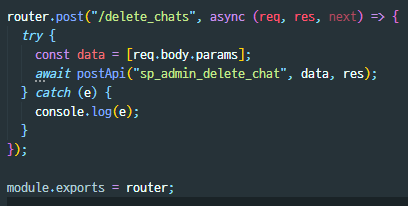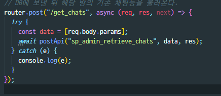 채팅과 관련하여 DB에서 프로시저로 작업하기 위해 해당 라우트로 들어오면 백엔드에서 실행시켜줄 라우터 코드들이다.