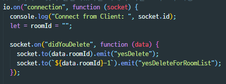 뒤에서 한번 더 설명하겠지만 A유저와 B유저가 한 채팅방에 있고, A유저가 채팅을 지웠을 경우에 상대방에게도 그 메시지가 삭제 되었다고 보여야할 것이다. 그걸 처리해주는 것이 socket.to(roomId).emit('yesDelete')이다. 또한 만약 마지막 채팅을 유저가 지웠다면 채팅방 목록에서도 삭제된 메시지 입니다 라고 보여져야할 것이다. 이걸 처리해주는 것이 socket.to(roomId).emit('yesDeleteForRoomList')이다.