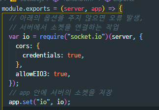 app.set에 io라는 이름으로 설정해두어서 request가 오면 request안에서 io를 사용할 수 있도록 설정해두었다.