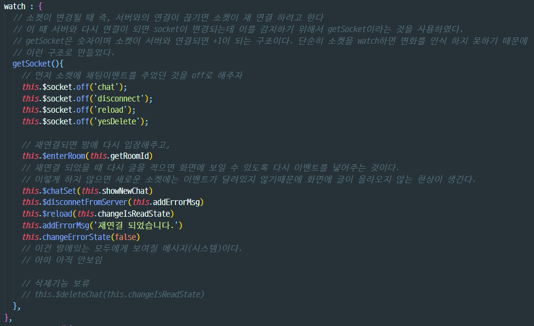 서버와의 연결이 끊긴 후에 다시 연결 된 경우 vuex의 특정 프로퍼티를 하나 올려줌으로써 소켓이 바뀐 걸 감지할 수 있도록 만들어 주었다.