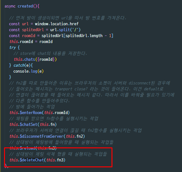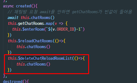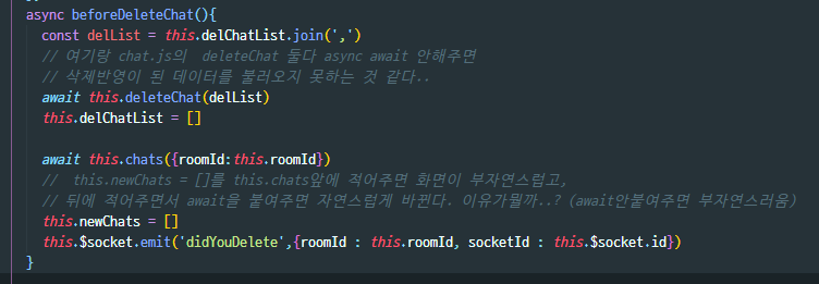 그리고 그 위에 deleChat도 비슷하다. vuex안에서도 await을 사용하였고 여기서도 사용하였는데, 둘 다 사용해주지 않으면 데이터를 제대로 못불러올 때가 있다. 이 부분도 사실 잘 이해가 되지 않긴하다.