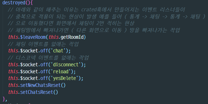 방에서 퇴장한 경우 화면도 destroyed가 되기 때문에 이 전에 주었던 이벤트 리스너를 다 없애주어야 한다.