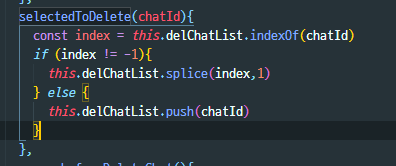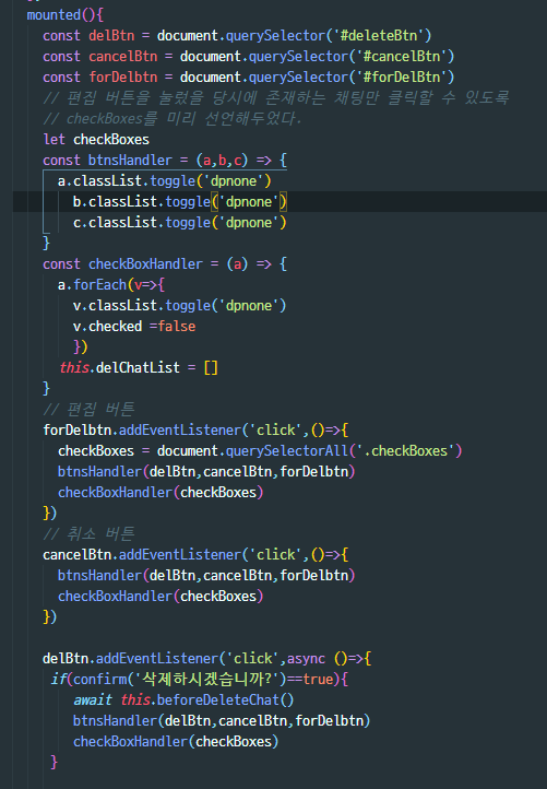 그 이유는 편집 버튼을 눌렀을 당시에 존재하는 채팅만 클릭할 수 있도록 한 것이다. ( 새로 작성한 채팅은 체크 할 수 없다 ) 따라서 저 변수를 다같이 공유하여 같은 상태의 체크박스들을 바라보는 것이다. 만약 새로 작성한 채팅을 체크하려면 다시 취소를 누른 뒤 편집을 눌러야 할 것이다. 여기서 특별한 것은 this.delChatList이다. 이건 체크한 채팅들의 id값이 들어가는 곳인데, 편집 버튼, 취소 버튼, 메시지 삭제 버튼을 누르건 다 this.delChatList를 마지막에 초기화를 시켜 버린다.