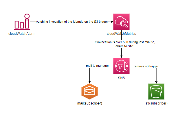 alarm 경보 -> sns -> 메일보내기, s3 trigger 제거 이렇게 되는 것이다.